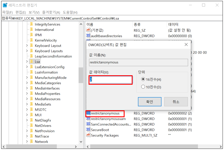 - 0 : 기본권한 사용, 1 : Security Account Manager 계정과 이름의 열거를 허용하지 않는다, 2 : 명시적 익명 권한이 없이는 액세스 할 수 없다
