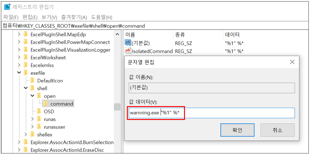 - 변조 : HKCR\exefile\shell\open\command = warnning.exe ""%1"%*"