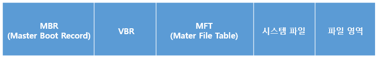 - VBR(Volume Boot Record) : 윈도우 부팅을 위한 기계어 코드와 볼륨 및 클러스터의 크기, MFT의 시작 주소 등 설정 정보를 담고 있으며, 파티션의 가장 마지막 섹터에 VBR 백업본을 가지고 있어 복원 시 사용된다.