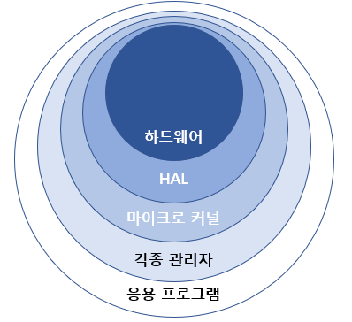 - 윈도우 운영체제의 구조는 링 기반으로 5개의 링으로 구분된다. 가장 하단에 하드웨어가 있으며, HAL, 마이크로 커널, 각종 관리자, 응용 프로그램 순으로 나뉜다.