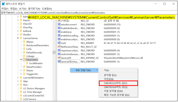 - 기본 공유제거 방법은 "net share 공유이름 /delete"이지만 운영체제가 재시작되면서 다시 자동으로 기본 공유 폴더를 만들기 때문에 완전히 제거하려면 레지스트리 편집기(\HKLM\SYSTEM\CurrentControlSet\services\LanmanServer\parameters)에서 DWORD를 "AutoShareServer"로 새로 만들어 0으로 설정한다.(Windows NT일 경우 : AutoShareWks)