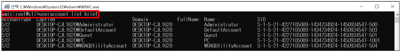 - 윈도우의 계정을 하나의 코드 값으로 표시한 것으로, "whoami /user" 명령어로 로그인 한 사용자의 SID를 확인 할 수 있다.