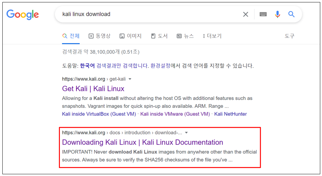 1) Google 검색에 'kali linux download' 검색 후 다운로드 사이트로 이동