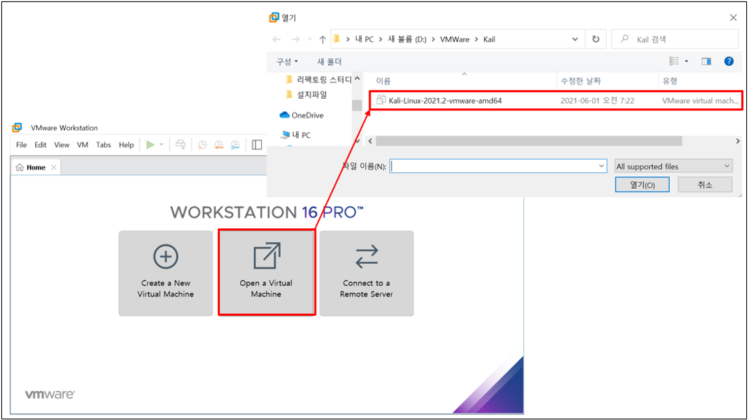4) Vmware에서 'Open a Virtual Machine' 클릭 후 KALI LINUX를 다운로드한 폴더에가면 '.vmx' 파일을 열기해준다.