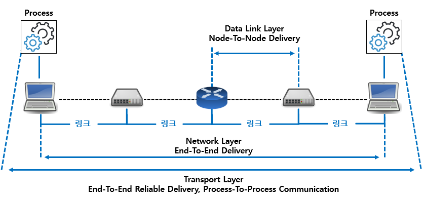 - 각 End 노드의 해당 Process간 신뢰성 있는 데이터 전송을 담당하는 계층으로 Process-To-Process Communication이라고도 한다.