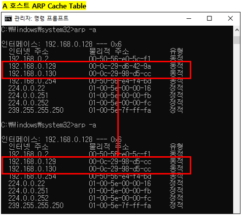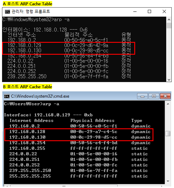 - ARP 프로토콜 특성 상 인증과정이 없기 때문에 A, B 호스트의 ARP Cache Table의 MAC 주소정보가 공격자의 MAC 정보로 변경된다.
