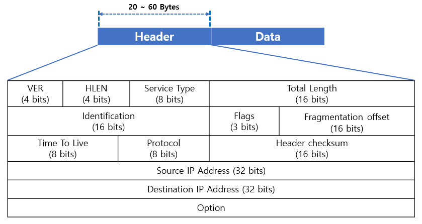 - Protocol(8 bits) : 상위 프로토콜을 식별하기 위한 프로토콜 번호를 저장하는 필드