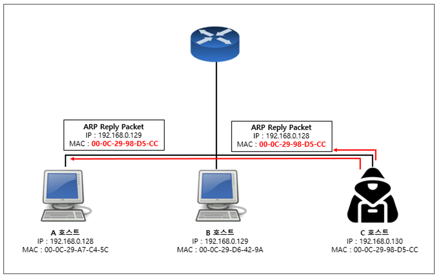 - 공격자가 A, B 호스트의 MAC 주소를 자신의 MAC 주소로 위조한 ARP Reply 패킷을 만들어 지속적으로 A, B 호스트에게 전송한다.