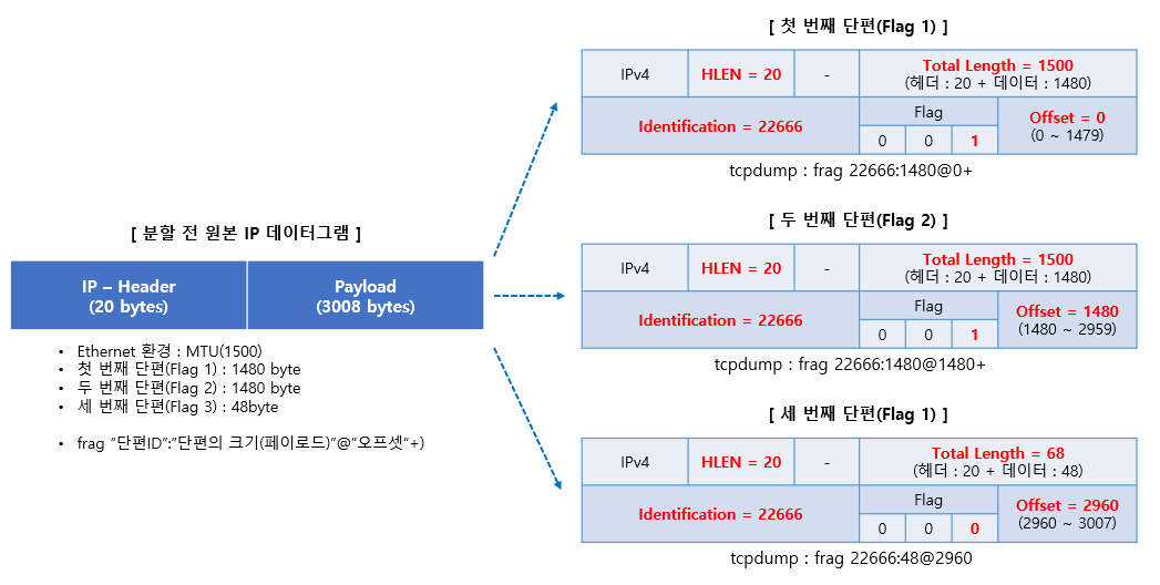 - IP 데이터그램을 여러조각으로 분할하는 것을 단편화(Fragmentation)이라하고 분할된 단편(Fragment)들을 조합하여 원본 IP 데이터그램을 완성시키는 것을 재조합(Reassembly)이라 한다.