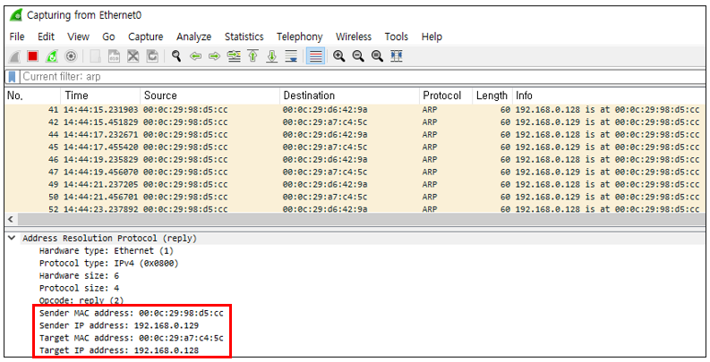 - #arpspoof -i [인터페이스] -t [B 호스트 IP] [A 호스트 IP] : B 호스트에게 A 호스트의 MAC 주소를 공격자의 MAC 주소로 ARP Reply를 보낸다.