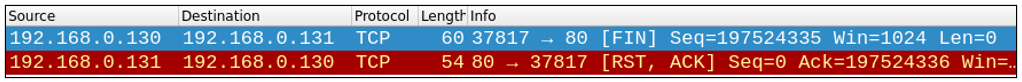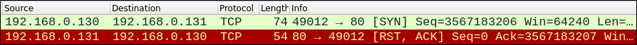 - (Wireshark) 80/tcp 포트 스캔 시 희생자로부터 RST+ACK 패킷이 온 것을 확인 할 수 있다.