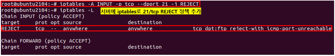 - iptables 방화벽의 REJECT 정책 : 해당 패킷을 폐기 후 ICMP Destination Unreachable 패킷을 응답한다.