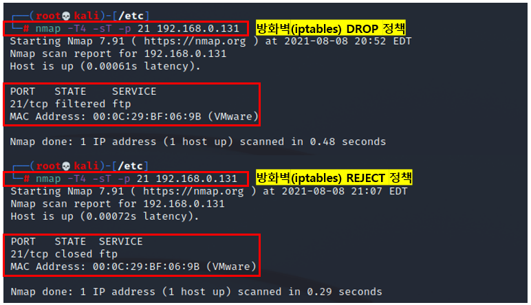 실습 (FILTERED 상태, #nmap -T4 -sT -p 21 [희생자 IP])
