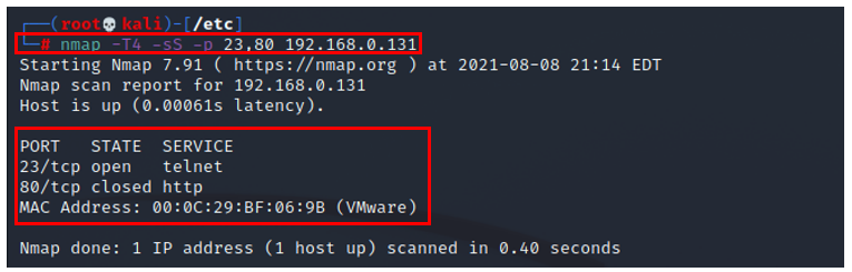 실습 (OPEN/CLOSED 상태, #nmap -T4 -sS -p 23,80 [희생자 IP])