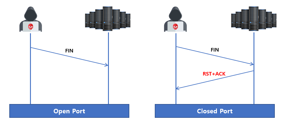 - 희생자의 포트 오픈 여부를 판단하는 것이 아니라 방화벽 룰셋(필터링 정책)을 알아내기 위한 스캔방식이다.