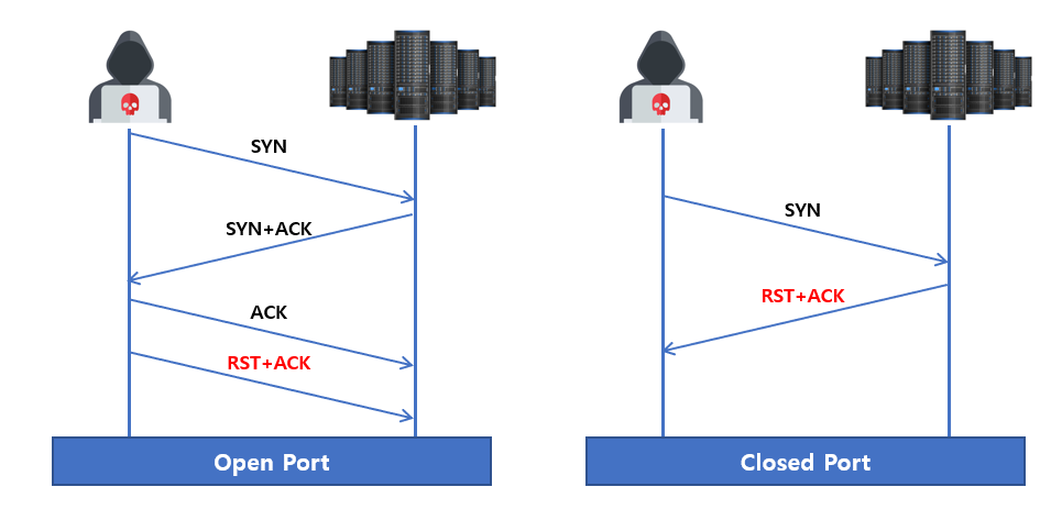 - 대상 포트가 열린 상태면 희생자로부터 SYN+ACK 응답이 오고 해당 응답만으로도 포트가 열린 상태임을 알 수 있기 때문에 연결을 완료하지 않고 패킷 조작을 통해 즉시 중단하기 위한 RST 패킷을 전송한다.