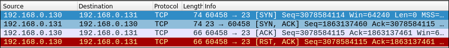 - (Wireshark) 희생자로부터 SYN+ACK 패킷이 왔으며 연결 미완료 상태에서 RST 패킷으로 즉시 연결을 중단한다.