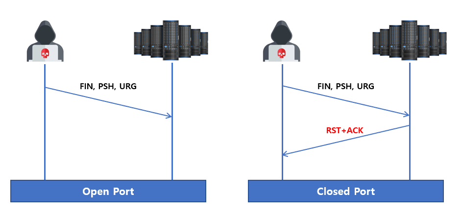 - 공격자는 희생자의 대상 포트로 URG, PSH, FIN 제어비트만 설정한 패킷을 전송한다.