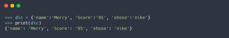 - 딕셔너리(Dictionary)을 만드는 방법은 키와 값을 중괄호({ })로 둘러싸고, 키와 값은 콜론(:)으로 구분이 된다.