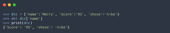 - 딕셔너리(Dictionary)의 키(Key)와 값(Value)의 쌍을 제거(수정X)하려면 "del"이라는 내장 함수를 사용한다.
