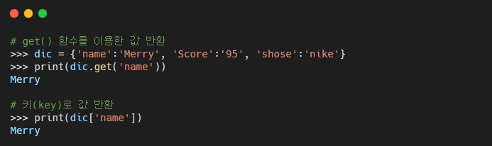 - 딕셔너리에 직접 키(Key)로 값을 확인 할 수 있지만, get() 함수를 이용해서 할 수도 있다.