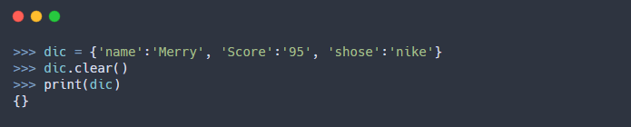 - 딕셔너리의 요소를 모두 제거하여 초기화 시키는 함수