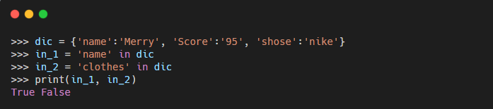 - 딕셔너리 내 해당 키가 존재하면 참(True), 존재하지 않는다면 거짓(False)를 반환한다.