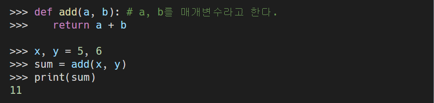 - def는 함수를 만들 때 사용하는 예약어이며, 함수 이름 뒤 괄호 안의 매개변수는 함수에 입력으로 전달되는 값을 받는 변수이다.