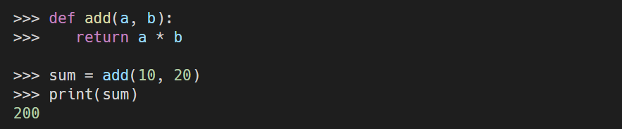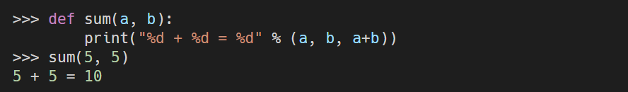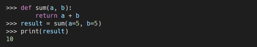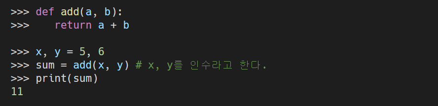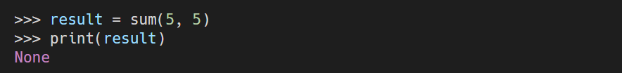- 만들어진 sum() 함수에 매개변수를 주어서 나오는 값인 "5 + 5 = 10"을 결과값으로 착각할 수도 있지만, "5 + 5 = 10"은 결과값이 아닌 sum() 함수 내 print() 함수의 결과가 출력된 것으로 결과값이 아니다.
