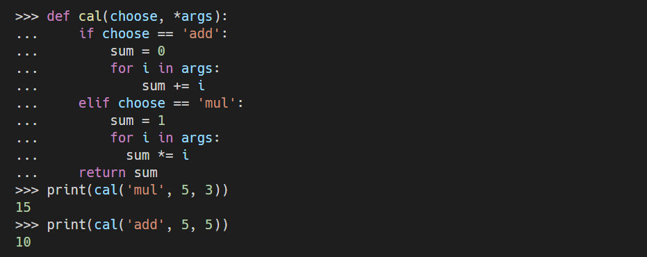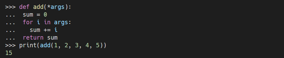 - *args는 임의로 정한 매개변수로 args는 관례적으로 사용하는 이름일 뿐, *ab, *abc 등 아무 이름이 와도 상관없다.