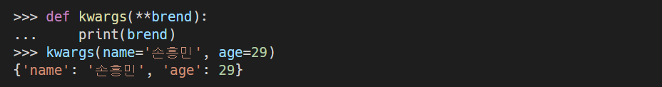 - 매개변수 이름 앞에 **을 붙이면 매개변수는 딕셔너리가 되고 모든 키(Key)와 값(Value) 형태의 결과값이 딕셔너리로 저장된다.