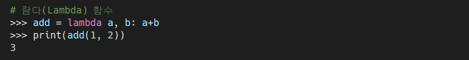 - lambda 예약어로 만든 함수는 return 명령어가 없어도 결과값을 반환해준다.