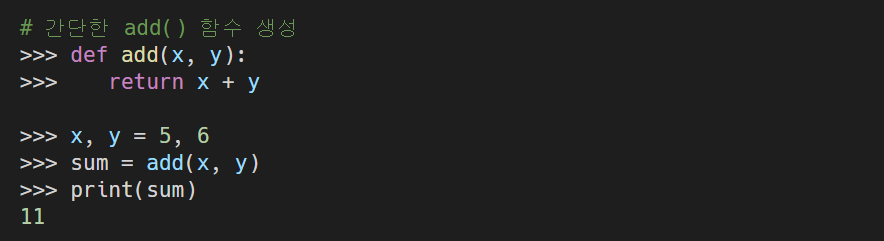 ① 변수 x, y를 생성 후 add() 함수에 x, y를 입력값으로 넣어준다.