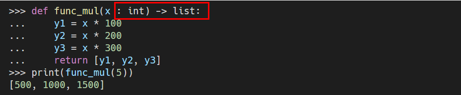 >>> def func_mul(x : int) -> list:
