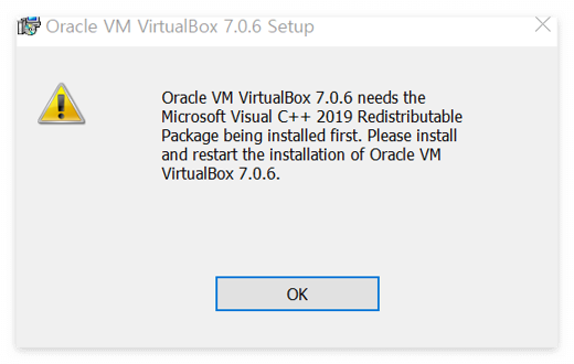 VirtualBox 설치 중 [그림 1.2]와 같은 "oracle vm virtualbox 7.0.6 needs the microsoft visual c++ 2019..." 에러가 난다면