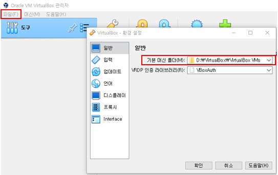 다운로드한 칼리 리눅스 압축 파일을 해제 후 VirtualBox 머신 폴더에 ".vdi, .vbox" 파일을 옮겨주며 다음 [그림 2.3]과 같이 VirtualBox 실행 후 "파일 - 환경설정"에서 기본 머신 폴더 경로를 확인할 수 있습니다.
