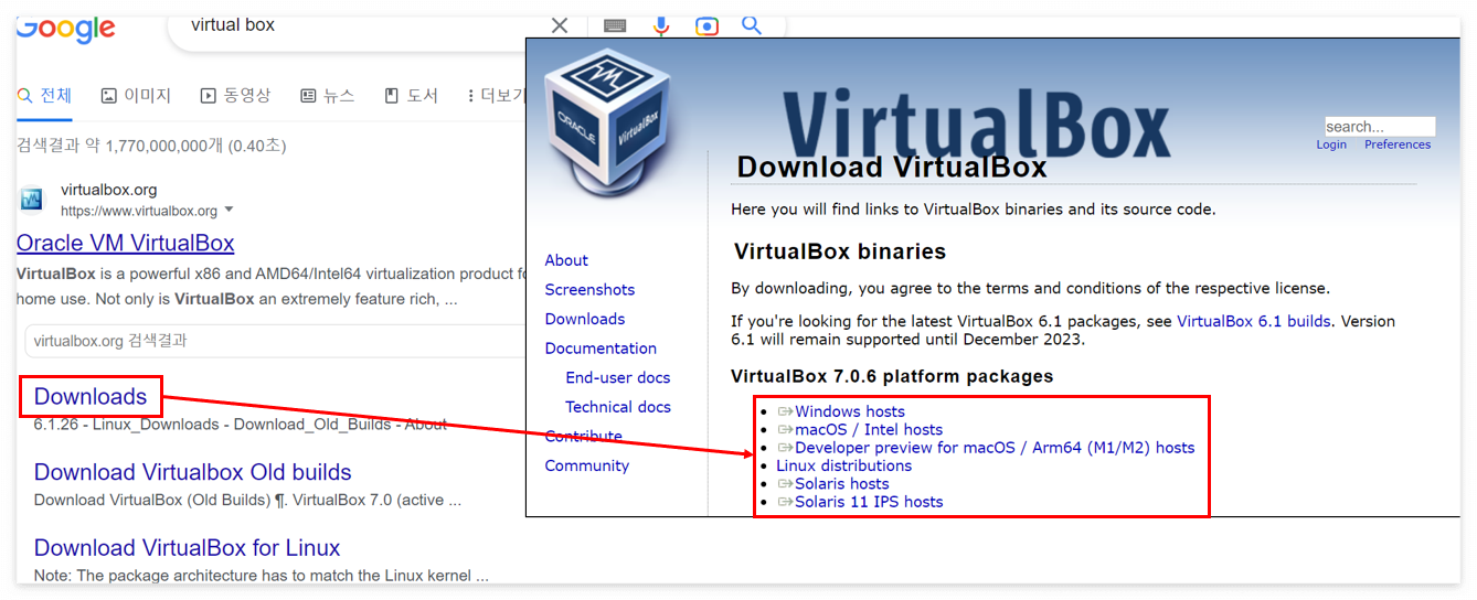 Google에 "VirtualBox"를 검색하면 [그림 1.1]과 같이 결과가 나오며 Oracle VM VirtualBox의 하위 항목의 Downloads를 클릭해줍니다.