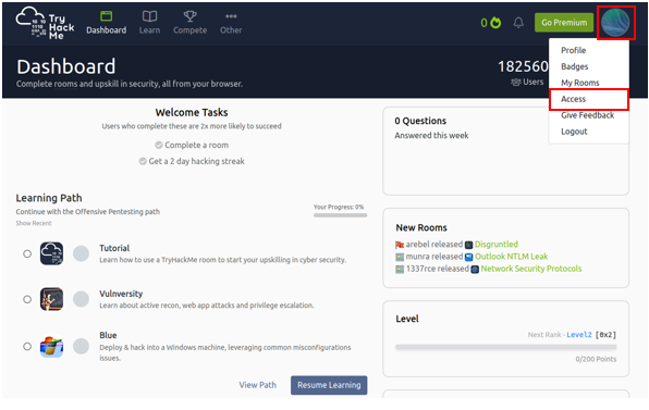 준비된 칼리 리눅스에서 Firefox 브라우저를 이용해 tryhackme.com에 접속 후 로그인 및 계정이 없다면 회원가입 후 진행해 줍니다. 로그인 후 메인화면에 자신의 프로필 클릭하게 되면 다양한 메뉴들이 나오는데 "Access"를 클릭해 줍니다.