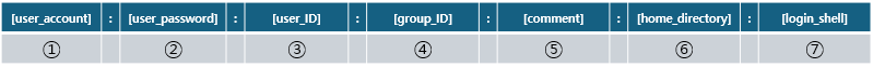 - UNIX는 시스템 관리자가 사용자 계정을 만들 때마다 해당 사용자와 관련된 정보를 /etc/passwd 파일에 저장합니다. passwd 파일에는 UNIX 시스템을 이용하는데 필요한 기본 정보들이 담겨 있으며, 이 파일의 각 라인은 개별 사용자에 대한 정보로 이루어져 있으며, 구분자 ':'를 이용하여 7개의 필드로 구분됩니다.