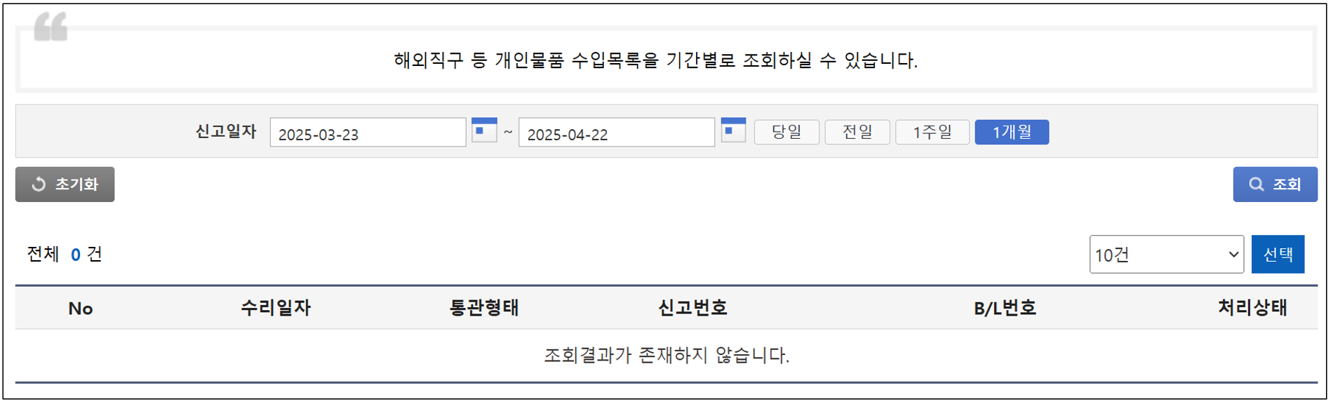 - [전체메뉴] → [해외직구 통관내역 조회] 메뉴를 클릭합니다.