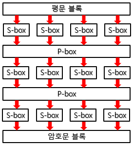 - 입력을 여러 개의 소블록으로 나누고 각 소블록을 S-box로 입력하여 대치시키고, 그 출력을 P-box로 전치하는 과정을 반복하는 방식이다.