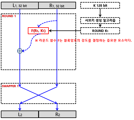 - Feistel 암호 방식의 강도를 결정하는 요소는 평문 블록의 길이(64비트 ▲), 키 K의 길이(128비트 ▲), 라운드 수(16회 ▲)이어야 안전하며, 키 K는 서브 키 알고리즘으로 각 라운드마다 사용되는 서브키 K를 생성하게 된다.